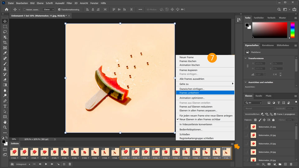 7. Während die duplizierten Frames noch ausgewählt sind, wähle im Menü den Befehl Frames umkehren.