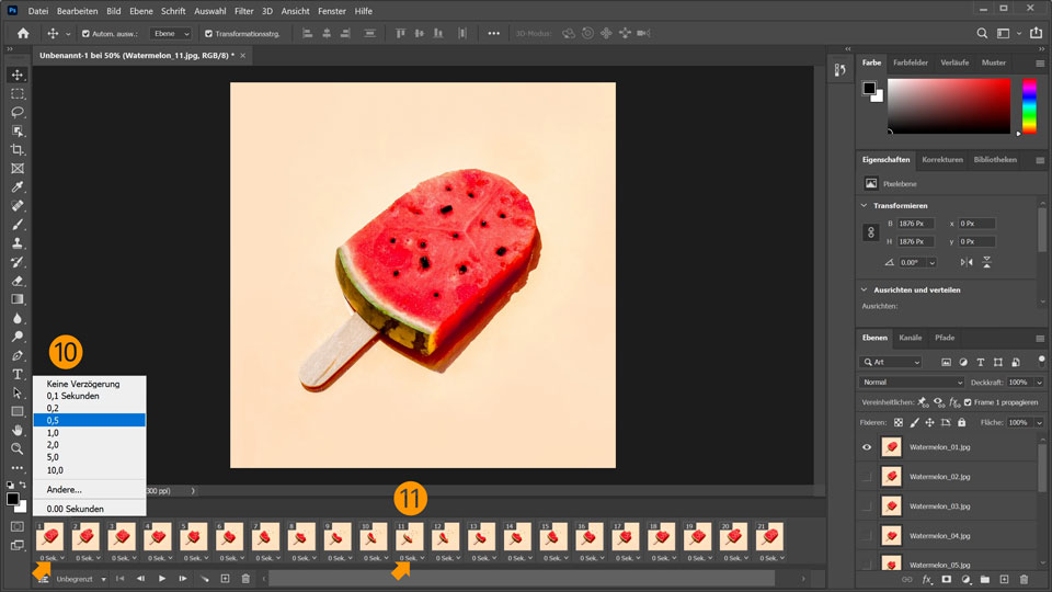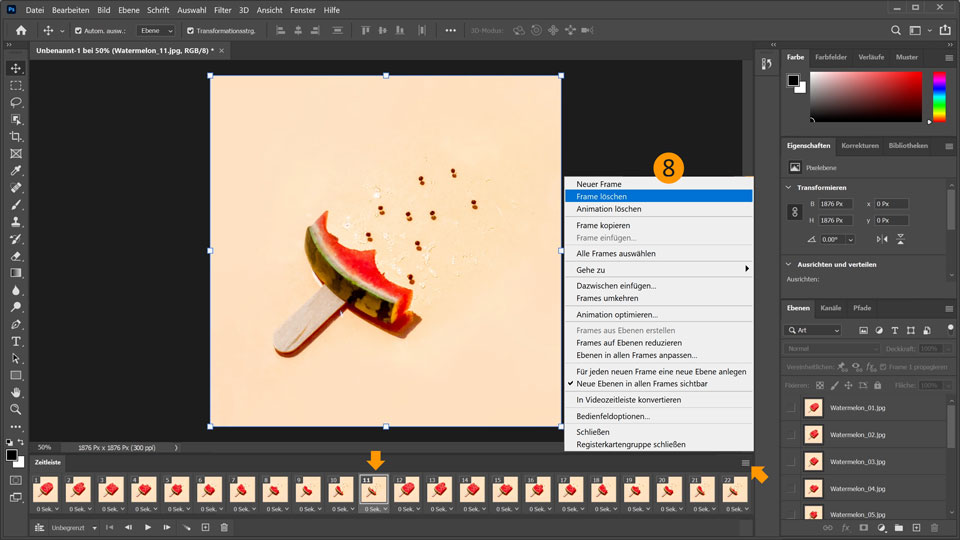 8. Von Frame 1 bis 11 wird die Wassermelone kleiner, von Frame 12 bis 22 baut sie sich wieder auf. Da Frame 11 und 12 in der Mitte der Animation identisch sind, lösche einen der doppelten Frames. Klicke auf Frame 12, und wähle im Menü den Befehl Frame löschen.