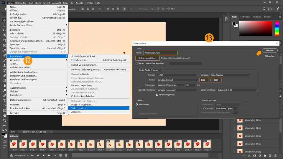 12. Speichere die Animation als Video für Instagram. Wähle Datei > Exportieren > Video rendern.