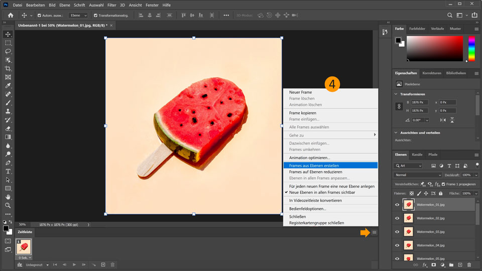 4. Klicke im Bedienfeld Zeitleiste oben rechts auf das Menüsymbol, und wähle im Bedienfeldmenü Frames aus Ebenen erstellen.