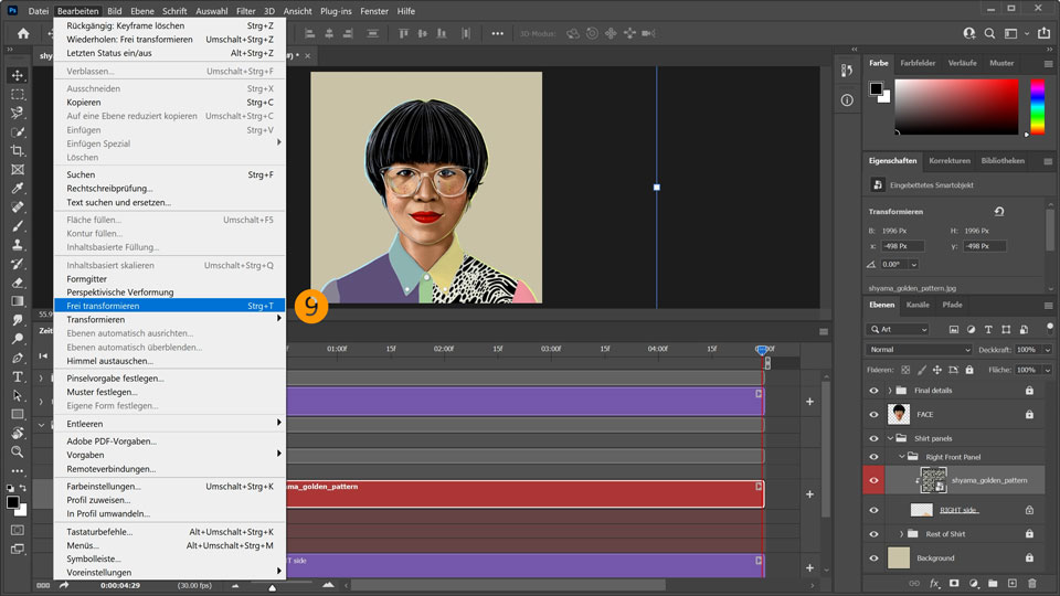 9. Wähle Bearbeiten > Frei transformieren. Alternativ kannst du Strg+T (Windows) bzw. Befehl+T (macOS) drücken.