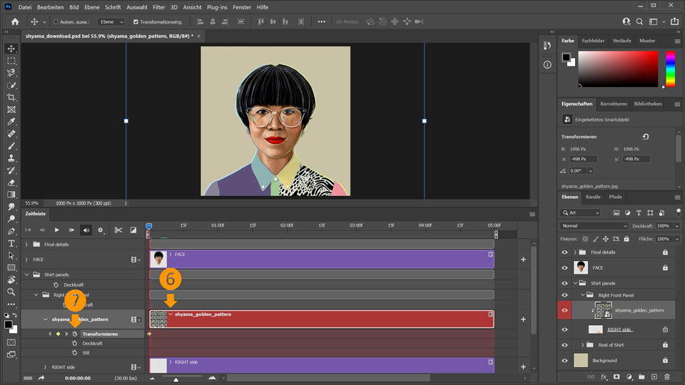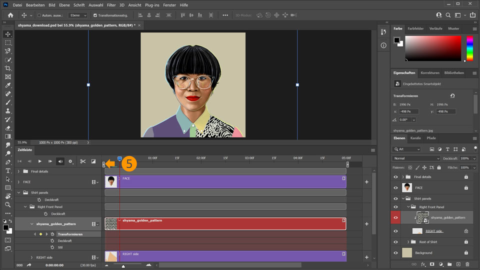 6. Erweitere auf der Zeitleiste die rote Ebene namens „shyama_golden_pattern“, indem du auf den kleinen Pfeil klickst. Es werden drei Steuerelemente für Animationen in Form von Stoppuhren angezeigt.