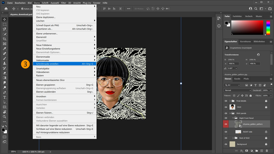 3. Wähle bei ausgewählter Ebene den Befehl Ebene > Schnittmaske erstellen. Jetzt befindet sich das Muster innerhalb des Kleidungsstücks.
