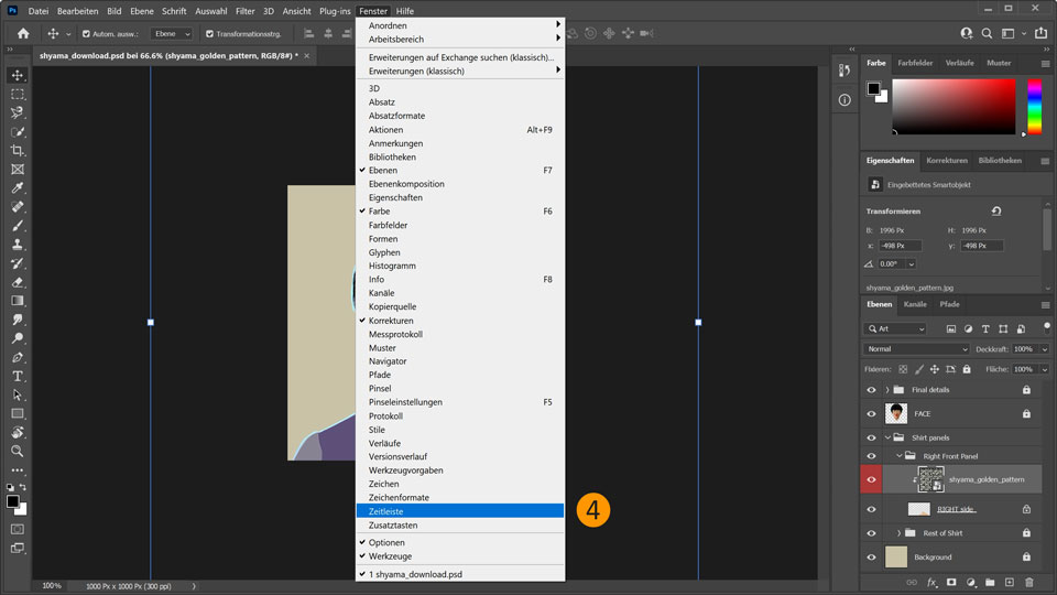 4. Öffne das Fenster „Zeitleiste“, in dem du Animationen auf einer Zeitleiste erstellen kannst. Wähle dazu Fenster > Zeitleiste.