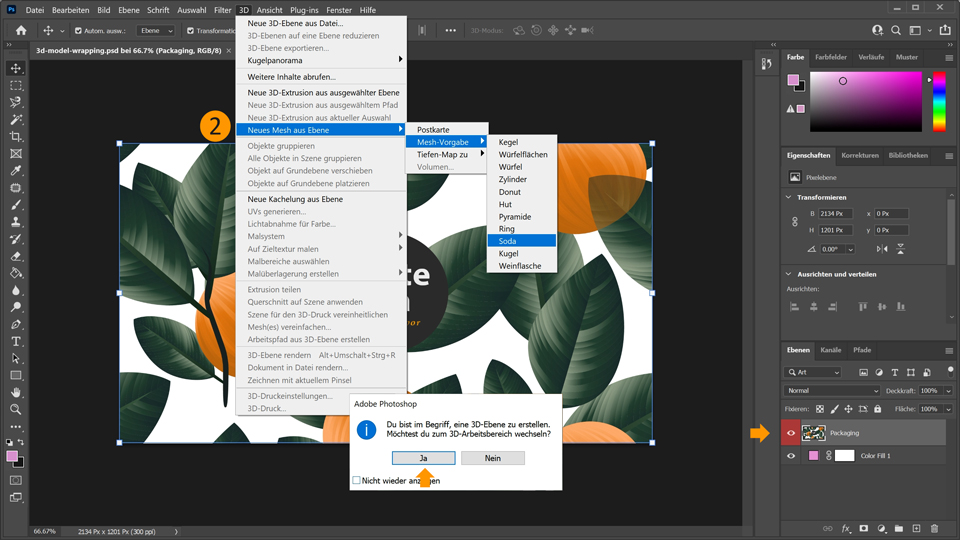 2. Wähle die Ebene „Packaging graphic“ aus. Navigiere dann zu 3D > Neues Mesh aus Ebene > Mesh-Vorgabe > Soda, um die Verpackungsgrafik auf einer 3D-Dose zu platzieren. Photoshop fragt dich, ob du zum 3D-Arbeitsbereich wechseln möchtest. Bestätige das mit Ja.