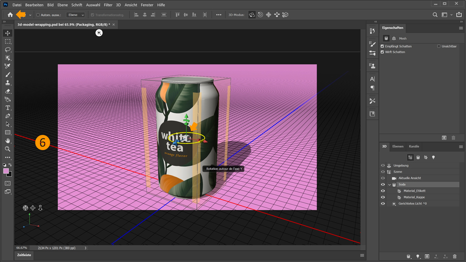 6. Drehe als Nächstes die Dose so, dass ihr Etikett innen direkt zum Betrachter zeigt. Klicke dazu auf die Dose, damit die 3D-Achse eingeblendet wird. Bewege den Cursor über die Markierung der rot dargestellten y-Achse, bis ein gelber Kreis eingeblendet wird.