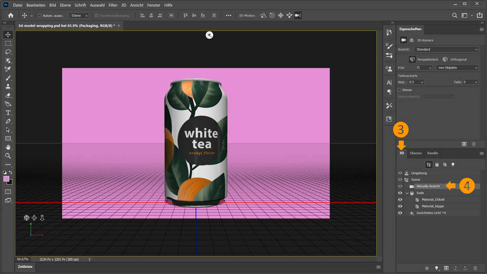 4. Setze die Szene im Bedienfeld „3D“ auf Aktuelle Ansicht.