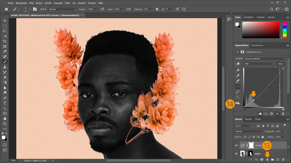 13. Wähle die Ebene mit dem Modell aus: Klicke auf Neue Misch- oder Einstellungsebene erstellen. Wähle die Option Gradationskurven.