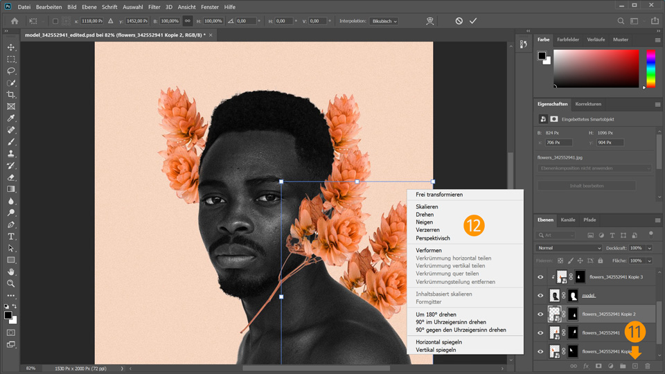 12. Drücke Strg+T (Windows) bzw. Befehl+T (macOS), um die Blüten zu drehen, zu spiegeln, zu verschieben oder ihre Größe zu ändern. Experimentiere mit diesen Optionen, bis du mit dem Ergebnis zufrieden bist.