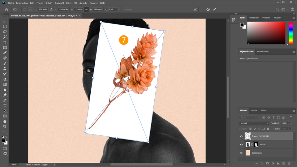 7. In den Beispieldateien findest du ein Bild mit Blumen („flowers_342552941.jpg“). Ziehe es in dein Photoshop-Dokument. Drehe und rücke das Bild zurecht. Drücke die Eingabetaste, um das Bild zu platzieren.