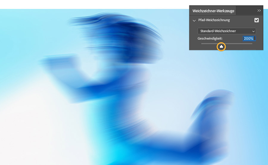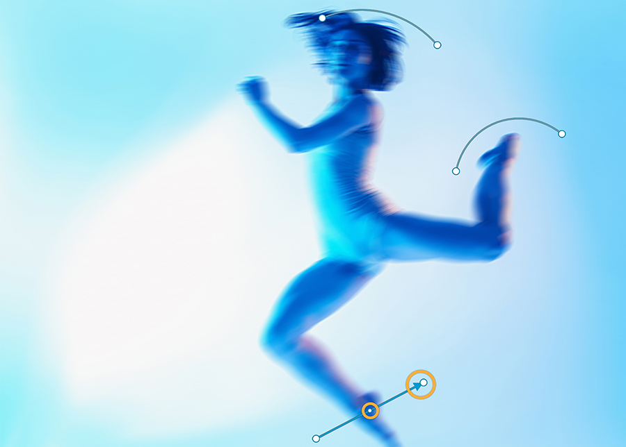 Kathleen Martin wendet auf das gesamte Bild einen Weichzeichner an und wählt dafür „Filter > Weichzeichnergalerie > Pfad-Weichzeichnung“. Um bestimmten Bereichen der Tänzerin den Anschein von Bewegung zu verleihen, aktualisiert sie zunächst die durch Adobe Photoshop eingefügten Standardmarker. Durch Ziehen an dem Pfeil kann sie die Bewegungsrichtung steuern. Zur Verfeinerung der Bewegung zieht sie auch an den Punkten. Anschließend fügt Kathleen Martin weitere Marker ein, indem sie bei aktiviertem Zeichenstift-Werkzeug auf das Bild klickt.