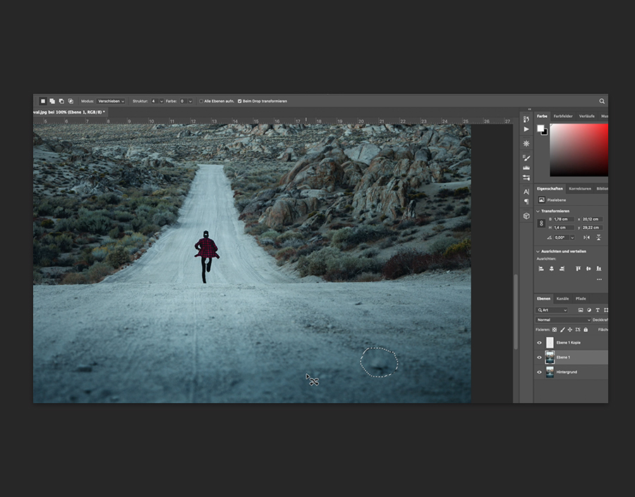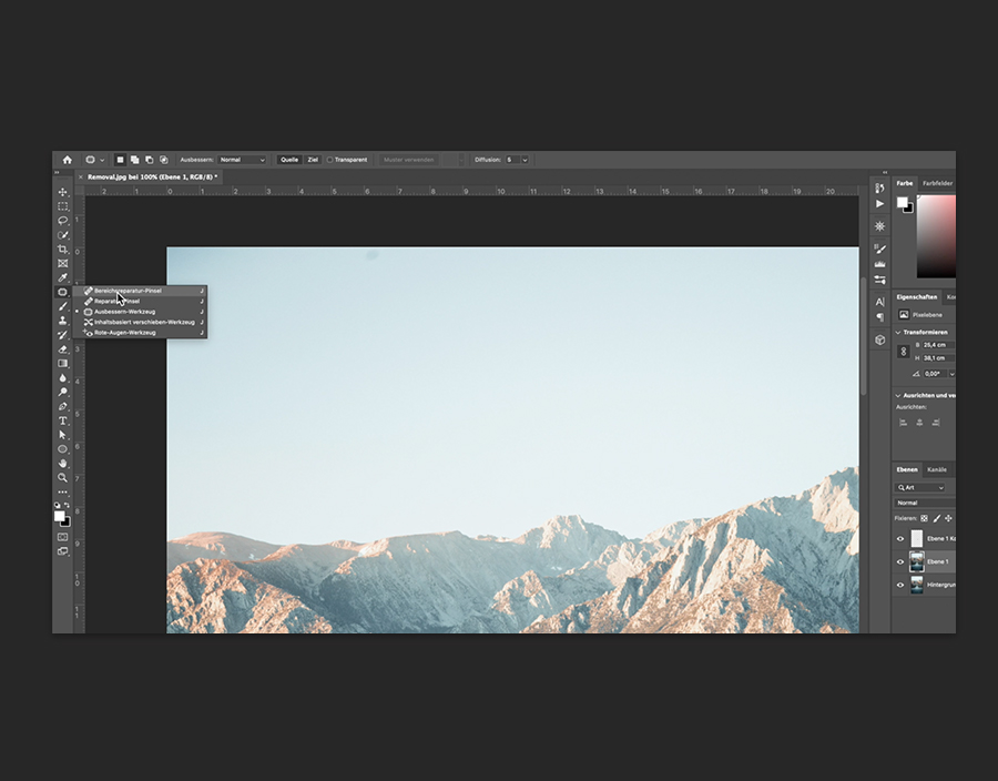 Vergewissere dich, dass du dich in der Bildebene befindest (wahrscheinlich Ebene 1). Wähle nun im linken Bedienfeld das Ausbessern-Werkzeug aus. Umrande grob das zu entfernende Objekt und ziehe deine Auswahl in einen Referenzbereich im Bild. Dadurch weiß Photoshop, dass es dessen Inhalt als Ausgangsmaterial verwenden soll. Jetzt kannst du zusehen, wie Photoshop seine Magie entfaltet.