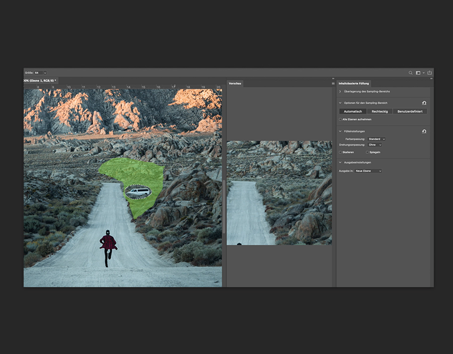 Bleibe in diesem Fenster und passe den grünen Bereich mit dem Cursor an. Photoshop kopiert Elemente aus dieser Auswahl. Wenn darin zum Beispiel große Steine zu sehen sind, aber der Bereich, den du aktualisierst, nur kleine Steine enthält, lohnt es sich, die Auswahl weiter einzugrenzen. Während du das tust, wird die Vorschau aktualisiert. Mach weiter, bis du mit dem Ergebnis zufrieden bist. Wähle anschließend Ausgabe in: Neue Ebene aus, damit die Bearbeitung in einer eigenen Ebene abgelegt wird, und klicke auf OK.