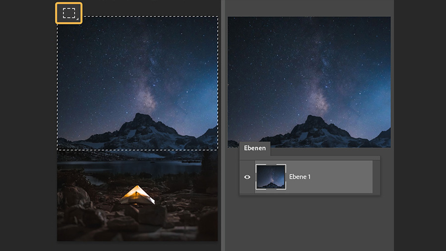 Wähle grob den Himmelsbereich mit dem Auswahlrechteck-Werkzeug aus. Drücke dann Strg + C (Windows) oder Befehl + C (macOS) aus, um ihn zu kopieren. Erstelle dann eine neue Datei („Datei“ > „Neu“) und füge die Ebene mit Strg + V oder Befehl + V ein.