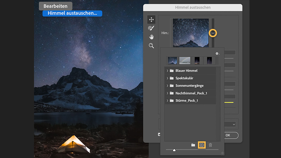 Wechsle wieder zum ursprünglichen Bild und wähle „Bearbeiten“ > „Himmel austauschen“. Klicke auf die Himmelsminiatur und dann auf das Plussymbol, um die soeben gespeicherte Bilddatei mit dem Himmel zu importieren.