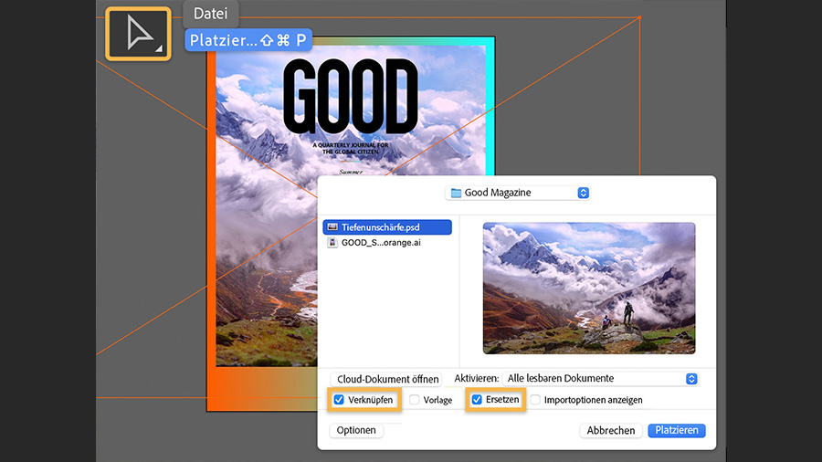 Öffne in Illustrator dieÜbungsdatei mit der Zeitschriftenvorlage . Klicke mit dem Auswahl-Werkzeug auf den pinken Platzhalter. Klicke dann auf „Datei > Platzieren“ und suche die im vorherigen Schritt erstellte PSD-Datei. Aktiviere, falls nötig, die Kontrollkästchen für „Verknüpfen“ und „Ersetzen“ und klicke auf „Platzieren“.