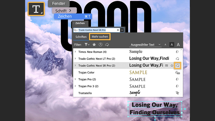 Markiere durch Ziehen mit dem Text-Werkzeug den Platzhalter für die Unterüberschrift. Klicke dann im Bedienfeld „Zeichen“ („Fenster > Schrift > Zeichen“) auf das Dropdown-Menü. Wähle „Mehr suchen“, um Adobe Fonts aufzurufen. Führe den Mauszeiger über verschiedene Schriftarten, um sie in der Vorschau anzuzeigen.