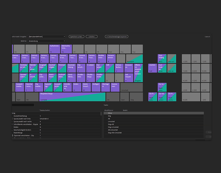 Für viele Aktionen in Premiere Pro können Tastaturkürzel verwendet werden. Drücke beispielsweise V, um das Auswahl-Werkzeug in der Zeitleiste zu aktivieren. Wenn du L drückst, werden deine Clips in der Zeitleiste oder in der Vorschau abgespielt. Durch mehrfaches Drücken der Taste kannst du die Wiedergabegeschwindigkeit erhöhen. Die Taste J funktioniert ähnlich, nur werden deine Clips in diesem Fall rückwärts abgespielt. Wenn du die Taste C drückst, wählst du damit das Rasierklingen-Werkzeug aus. Weitere hilfreiche Tastaturkürzel: Befehlstaste/Strg+C zum Kopieren, Befehlstaste/Strg+V zum Einfügen und Befehlstaste/Strg+X zum Ausschneiden. Drücke die Befehlstaste/Strg+Optionstaste/Alt+K , um ein Fenster mit einer Übersicht aller Tastaturkürzel anzuzeigen. Du kannst sogar eigene Tastaturkürzel erstellen.