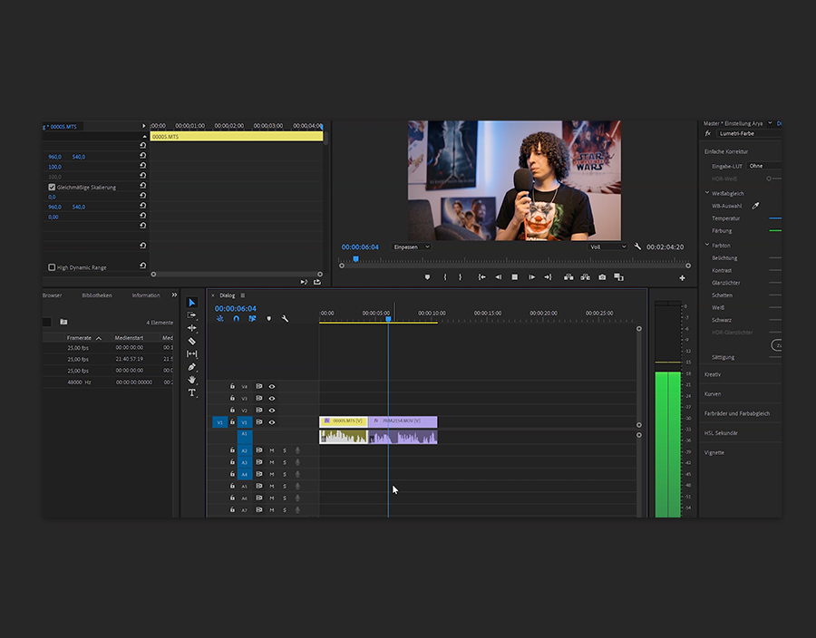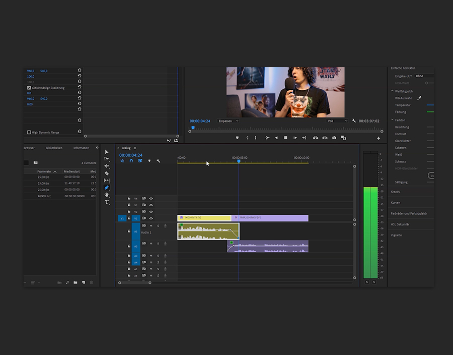 Natürlich ist großartiges Bildmaterial wichtig, doch solltest du dabei den Ton nicht vergessen. Achte darauf, dass deine Clips, nachdem du sie gemeinsam bearbeitet hast, ungefähr auf dieselbe Lautstärke eingestellt sind. Klicke in der Zeitleiste jeweils auf einen Audio-Clip und wechsle in das Bedienfenster Effektsteuerung , um mit den Pegeln zu experimentieren. Blättere nach unten zu Audio > Lautstärke > Stufe und probiere verschiedene Werte aus, um herauszufinden, was am besten klingt.