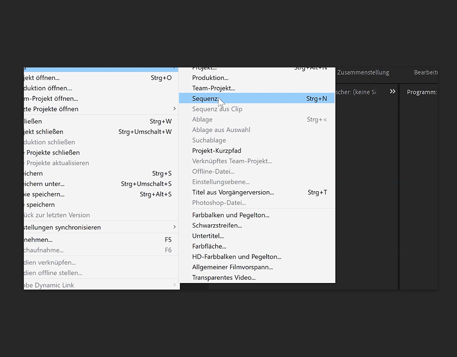Bevor du in Premiere Pro mit der Arbeit beginnst, musst du deine Projektordner einrichten. Erstelle einen Ordner auf deinem Computer und füge deine Video- und Audiodateien in jeweils eigenen Unterordnern hinzu. Öffne Premiere Pro, klicke auf Neues Projekt , benenne die Datei, suche nach deinem Projektordner und klicke auf Ordner auswählen. Erstelle dann eine Sequenz, die du bearbeiten kannst. Wechsle zu Datei > Neu > Sequenz und wähle eine der Standardeinstellungen aus oder lege hier deine eigenen Einstellungen fest. Du kannst nun dein Material per Drag-and-Drop entweder in das Projektfenster oder direkt in die Bearbeitungssequenz ziehen und dann den Ordnern hinzufügen.