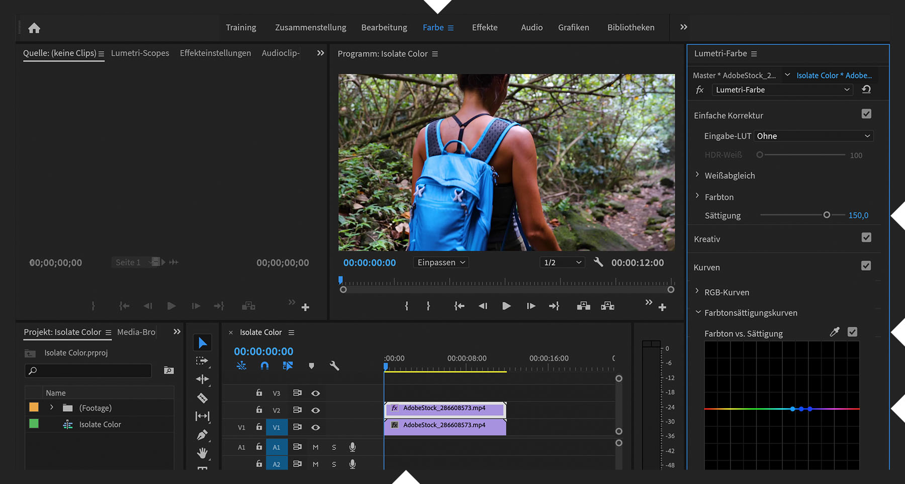 Platziere dein Footage – idealerweise Footage mit natürlicher Sättigung – in eine Sequenz. Rufe den Arbeitsbereich „Farbe“ auf. Klicke bei gedrückter Wahl- bzw. Alt-Taste auf den Video-Clip im Schnittfenster. Ziehe ihn nach oben, um eine Kopie auf der darüberliegenden Spur zu erstellen. Lasse den oberen Clip ausgewählt. Erweitere im Bedienfeld „Lumetri-Farbe“ den Bereich „Einfache Korrektur“. Erhöhe die Sättigung ein wenig mithilfe des gleichnamigen Reglers – je nachdem, wie gedämpft die Farben aktuell sind. Öffne den Bereich „Kurven“. Aktiviere die Pipette für die Kurve „Farbton vs. Sättigung“. Klicke auf die Farbe, die du in deiner Aufnahme isolieren willst. Dadurch werden drei Keyframes auf der Kurve platziert (horizontale Linie).