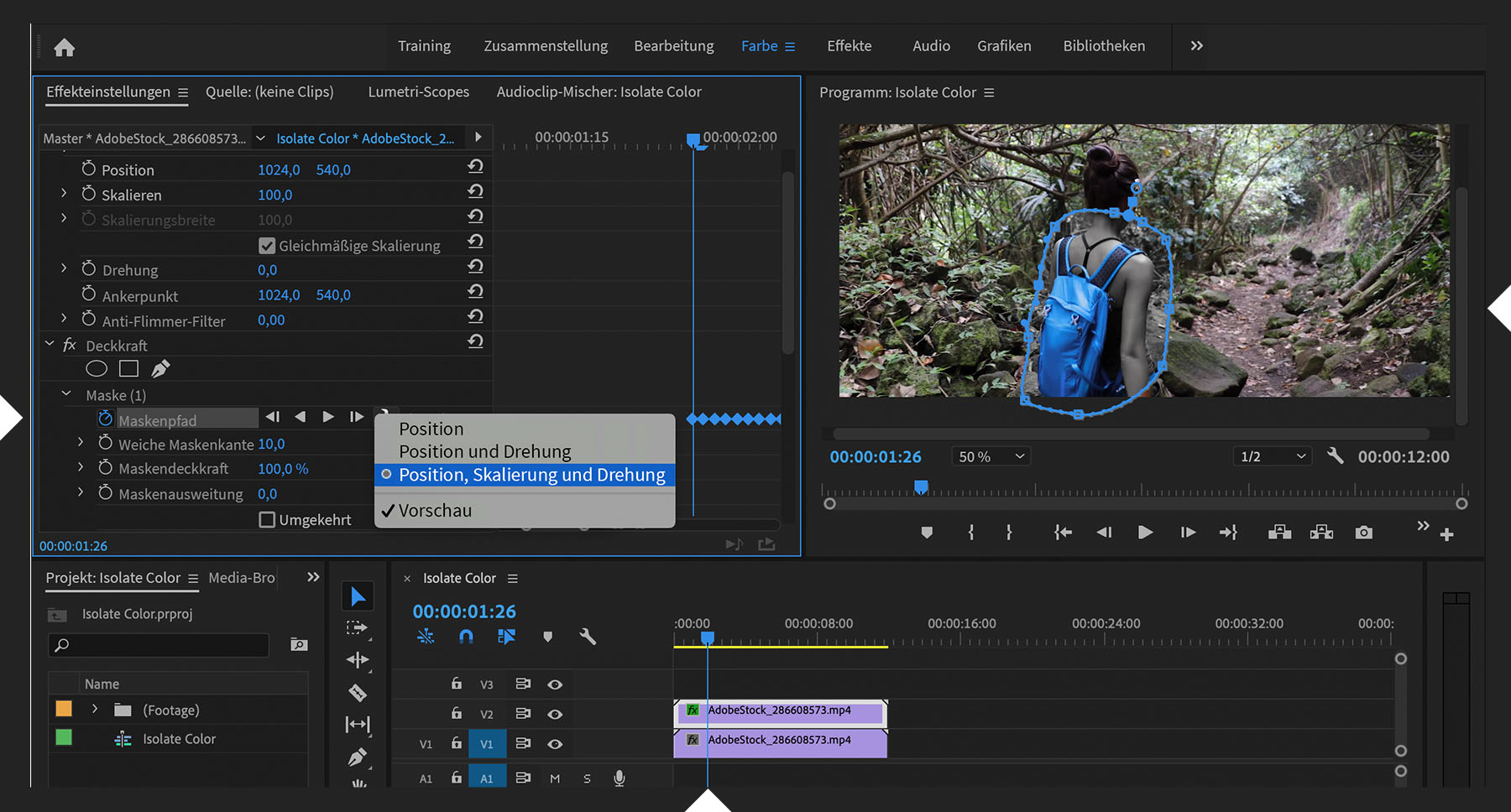Wenn es nicht möglich ist, durch Anpassung der Kurvenbreite alle Farbspuren aus den anderen Bereichen auszuschließen, maskiere das Hauptmotiv, sodass der Bereich, auf den sich die Anpassungen der Kurve unter „Lumetri-Farbe“ auswirken, eingeschränkt wird. In diesem Beispiel sollen das Blau des Rucksacks hervorgehoben, aber alle Spuren von Blau auf der Hose, den Socken und im Gestrüpp entfernt werden. Öffne das Bedienfeld „Effekteinstellungen“ (Umschalt+5). Klicke auf eines der Werkzeuge für Deckkraftmasken. Erhöhe den Zoom-Faktor im Programmmonitor, um Maskenform und -position leichter anzupassen.
