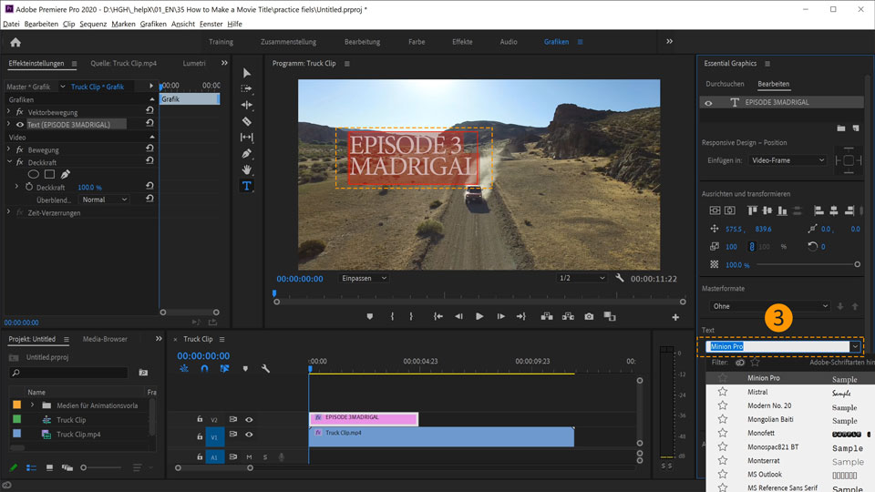 3. Ändere die Schrift. Markiere dazu den Titel, und klicke rechts im Bedienfeld Essential Graphics im Abschnitt Text auf den Namen der aktuell eingestellten Schrift.