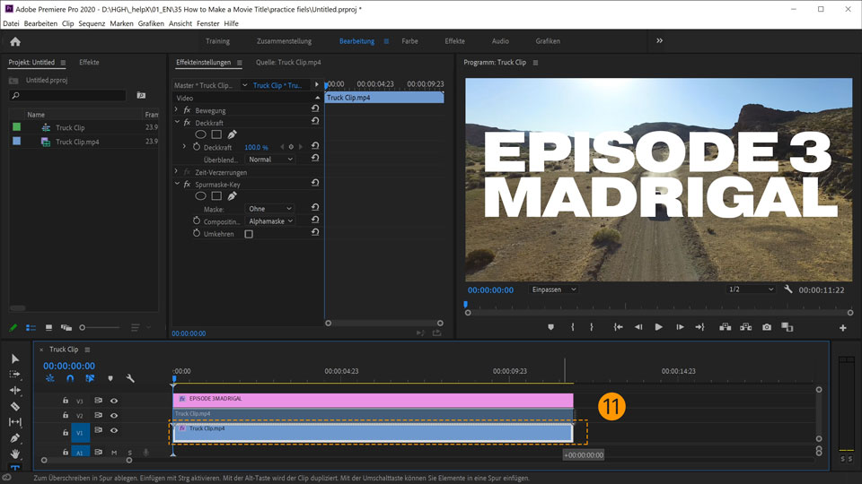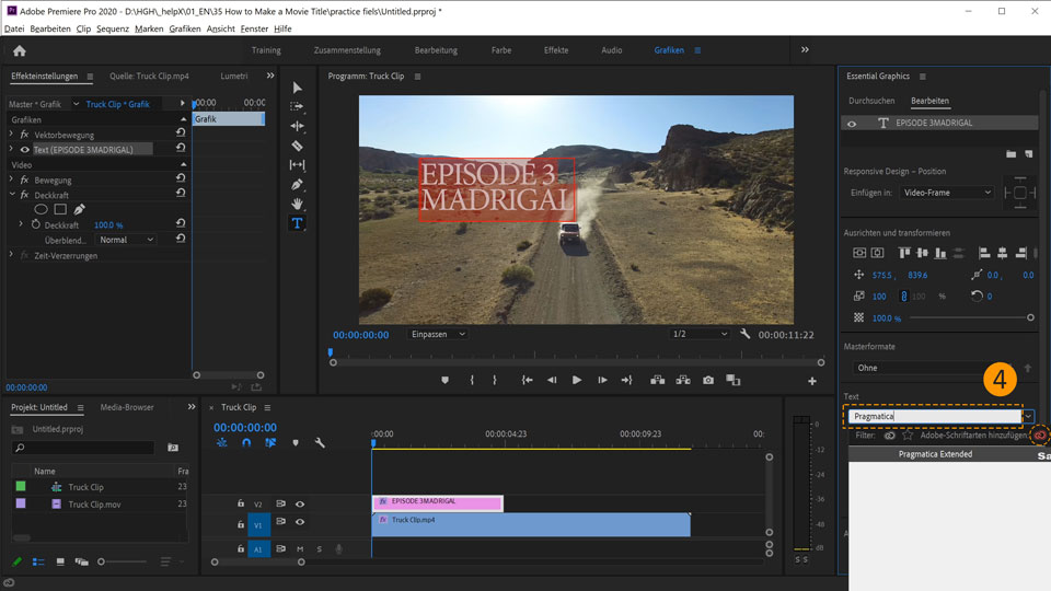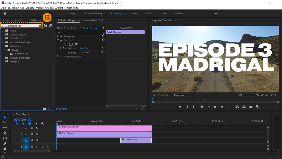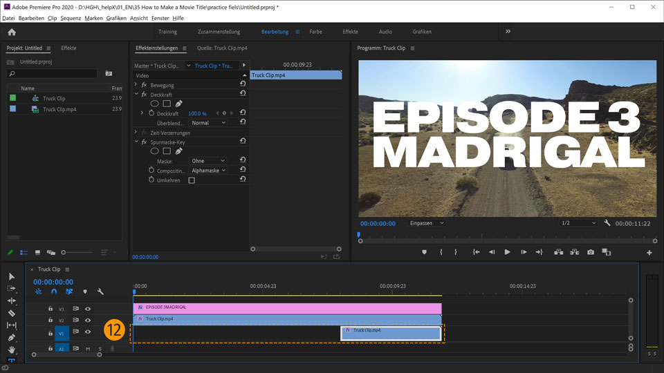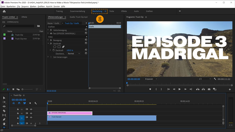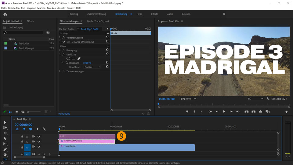 2. Klicke auf das Video im Programmmonitor. Gib „EPISODE 3 MADRIGAL“ ein. Damit wird der Videospur V2 ein neuer Grafik -Clip hinzugefügt.
