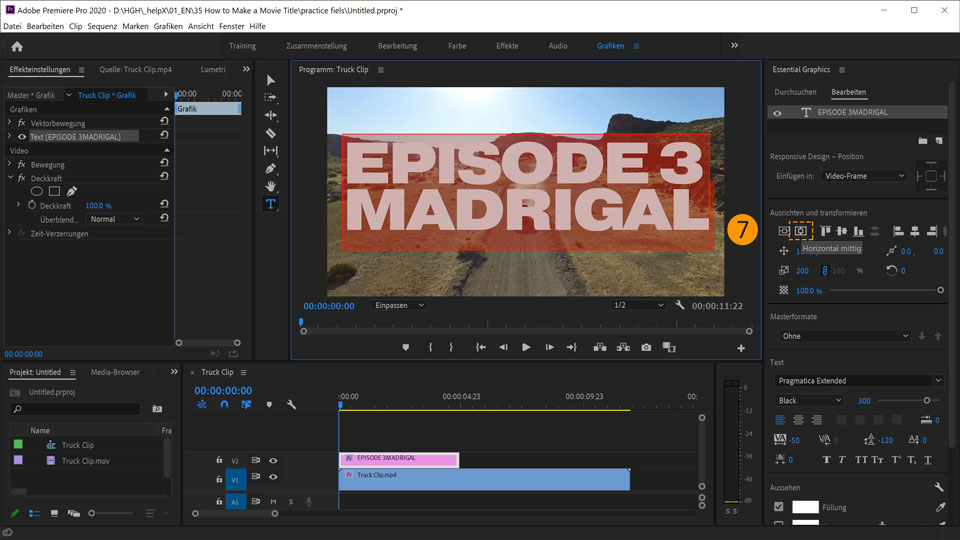 7. Ändere die horizontale Ausrichtung des Titels. Klicke dazu im Bedienfeld Essential Graphics im Abschnitt Ausrichten und transformieren auf das Icon Horizontal mittig.