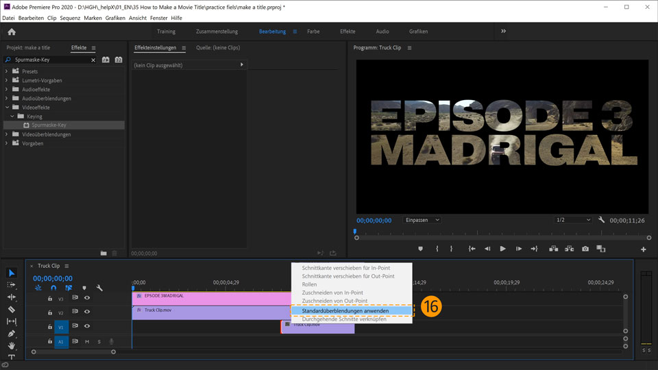 16. Für einen harmonischen Übergang vom Titeleffekt zum Video fügst du jetzt einen Fade-in-Effekt zur Kopie des Truck-Clips auf der Videospur V1 hinzu. Mache einen Rechtsklick bzw. Ctrl-Klick auf die Anfangsmarkierung des Video-Clips auf V1. Wähle im Kontextmenü die Option Standardüberblendungen anwenden.