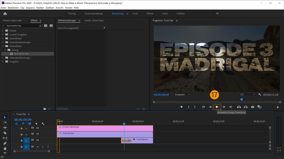 17. Um eine Vorschau des Titeleffekts anzuzeigen, klicke im Programmmonitor auf Abspielen, oder drücke die Leertaste.