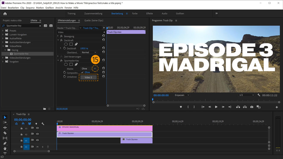 15. Navigiere zum Bedienfeld Effekteinstellungen. Wähle im Abschnitt Spurmaske-Key im Dropdown-Menü Maske die Option Video 3.