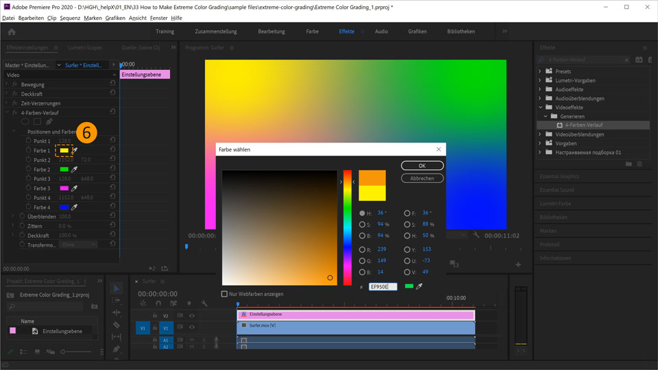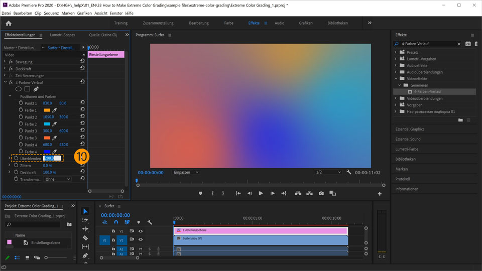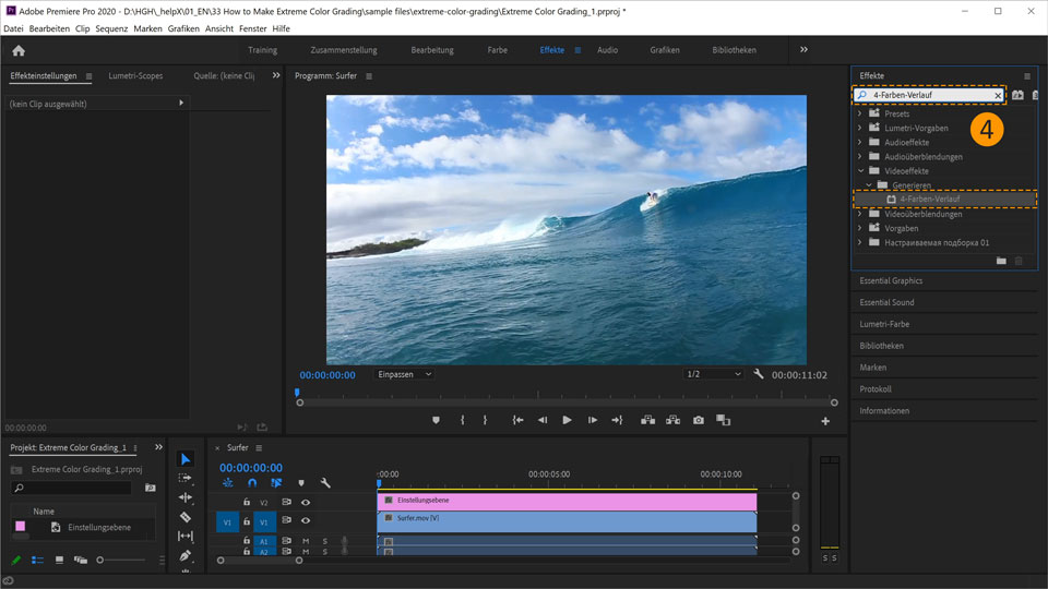 5. Klicke auf den Effekt 4-Farben-Verlauf. Ziehe ihn auf die Einstellungsebene im Schnittfenster.