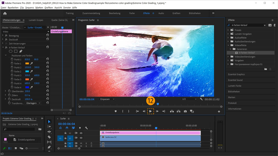 Fertig! Jetzt weißt du, wie du mit Premiere Pro in ca. 60 Sekunden einem Clip einen kunstvollen vierfarbigen Verlaufseffekt verleihst. Lade die Beispieldatei herunter, oder verwende eine eigene. Poste das Ergebnis bei Facebook, Twitter und Instagram mit dem Hashtag #MadewithPremiere, um Feedback zu deinem Bild zu erhalten und dich mit anderen Kreativen zu vernetzen.