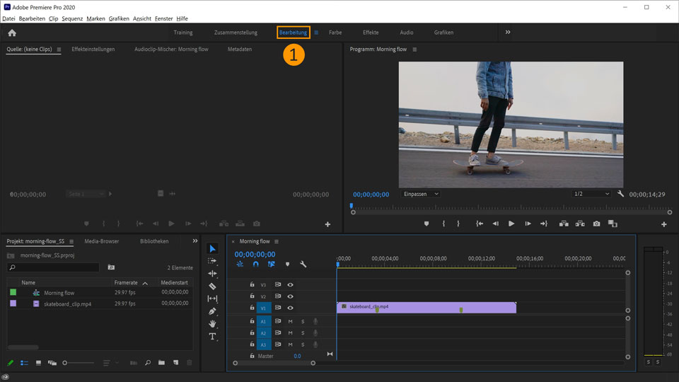 1. Lade dieÜbungsdateien herunter. Öffne die Datei „clips-social-media.prproj“ in Premiere Pro. Öffne den Arbeitsbereich Bearbeitung.
