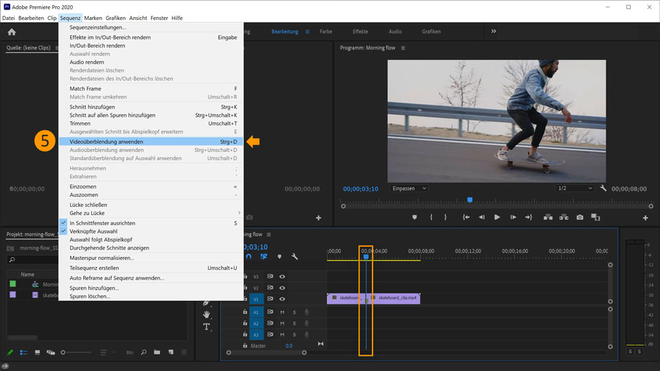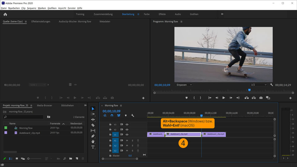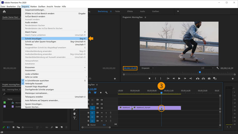 2. Kürze den Clip. Verschiebe den Abspielkopf im Schnittfenster auf die Position 00;00;03;10. Wähle Sequenz > Schnitt hinzufügen, um den Clip „skateboard_clip.mp4“ zu schneiden. Alternativ kannst du Strg+K (Windows) bzw. Befehl+K (macOS) drücken.