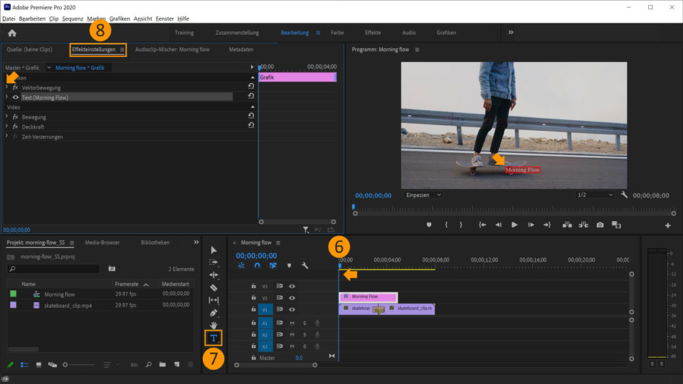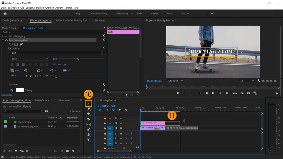 7. Wähle auf der Werkzeugleiste das Text-Werkzeug (T) aus. Bewege den Cursor zur Videovorschau im Programmmonitor. Klicke auf die Vorschau. Gib den Text Morning Flow ein.