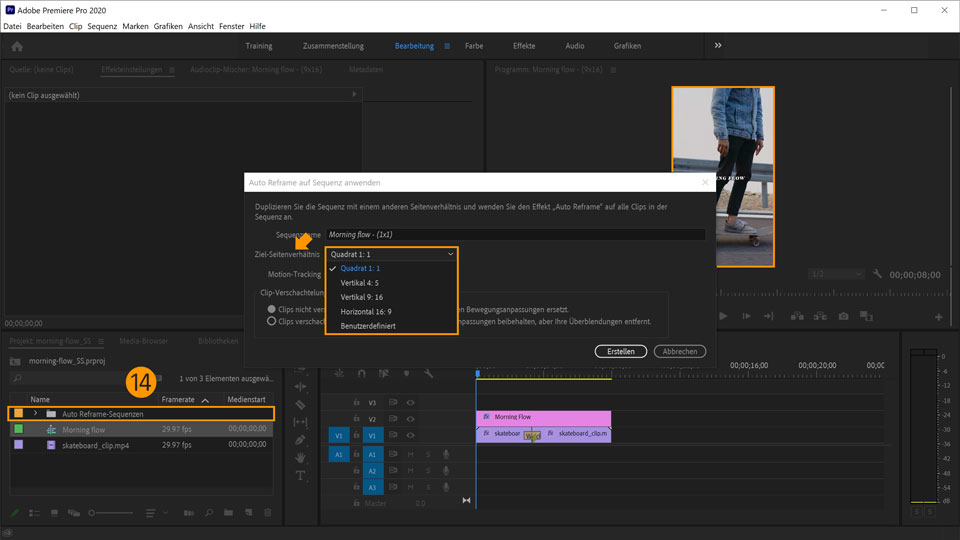 12. Wähle im Projektfenster die Sequenz Morning flow und dann Sequenz > Auto Reframe auf Sequenz anwenden.