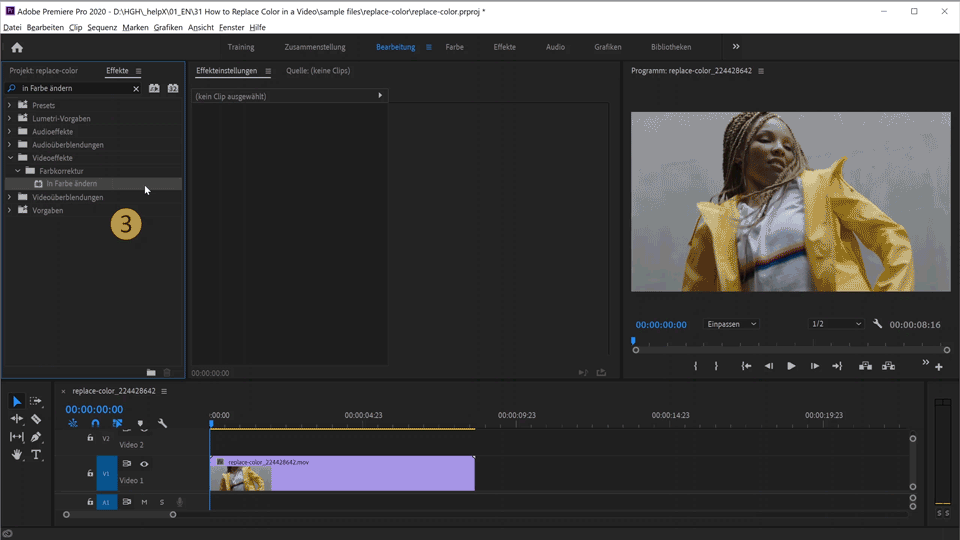 2. Im Bedienfeld Effekte kannst du nach Effekten suchen, indem du den Namen oder ein Stichwort im Suchfeld eingibst. Gib In Farbe ändern ein, bis der Effekt im Bedienfeld angezeigt wird.