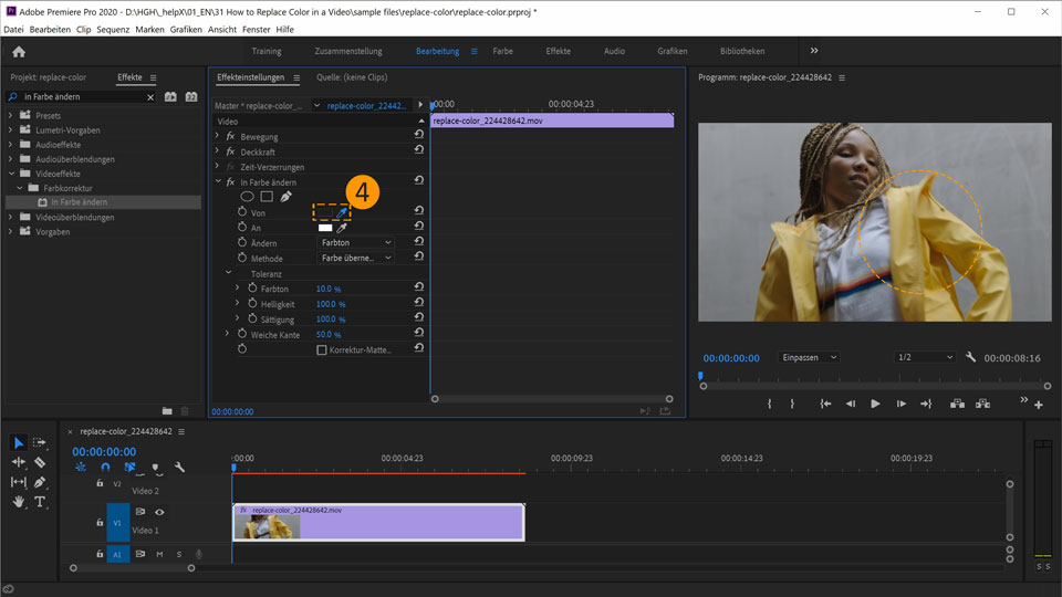 4. Wähle im Abschnitt Von die Pipette aus. Der Cursor wechselt daraufhin zu einer Pipette. Nimm die gelbe Farbe der Jacke im Programmmonitor auf.