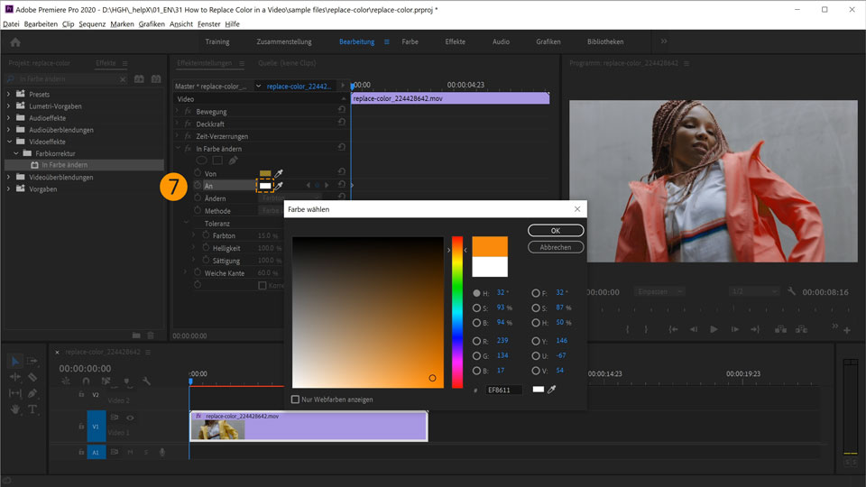 9. Klicke im Abschnitt An erneut auf das kleine Farbfeld, um das Dialogfeld Farbe wählen zu öffnen. Wähle mithilfe des Farbbalkens in der Mitte einen Rotton aus. Klicke auf OK. An dieser Stelle im Video ändert sich die Farbe der Jacke nun in Rot.