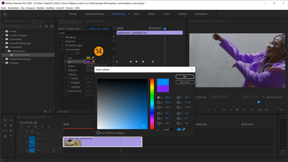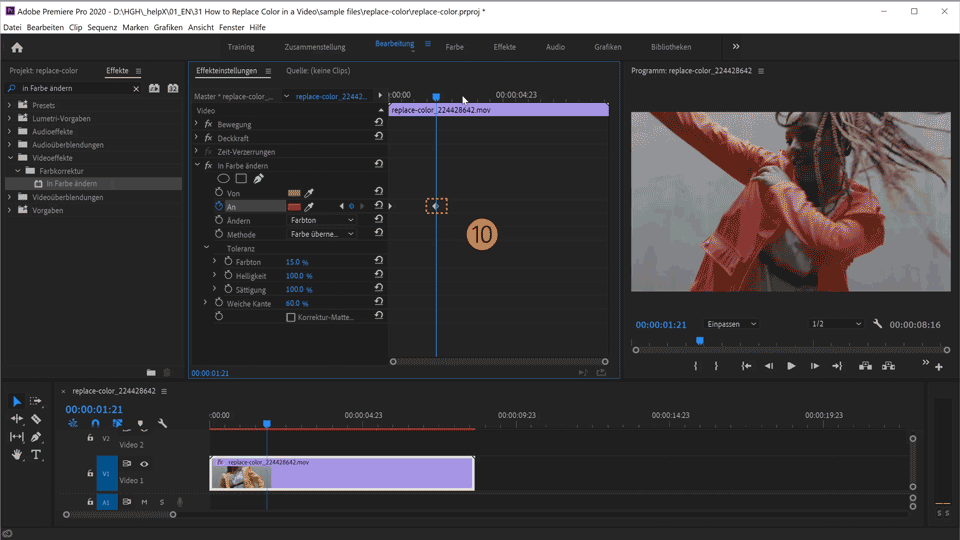 12. Ziehe den Abspielkopf zur nächsten Stelle. Ändere in den Einstellungen zum Effekt In Farbe ändern unter An die Farbe in Lila. Es wird automatisch ein Keyframe gesetzt. Klicke und ziehe den Abspielkopf, um die bisherigen Farbwechsel in der Vorschau anzuzeigen.