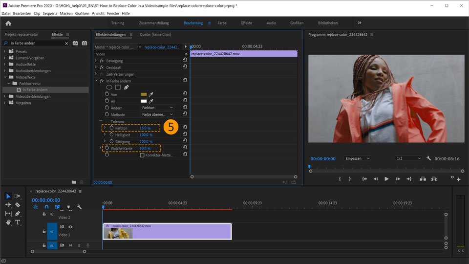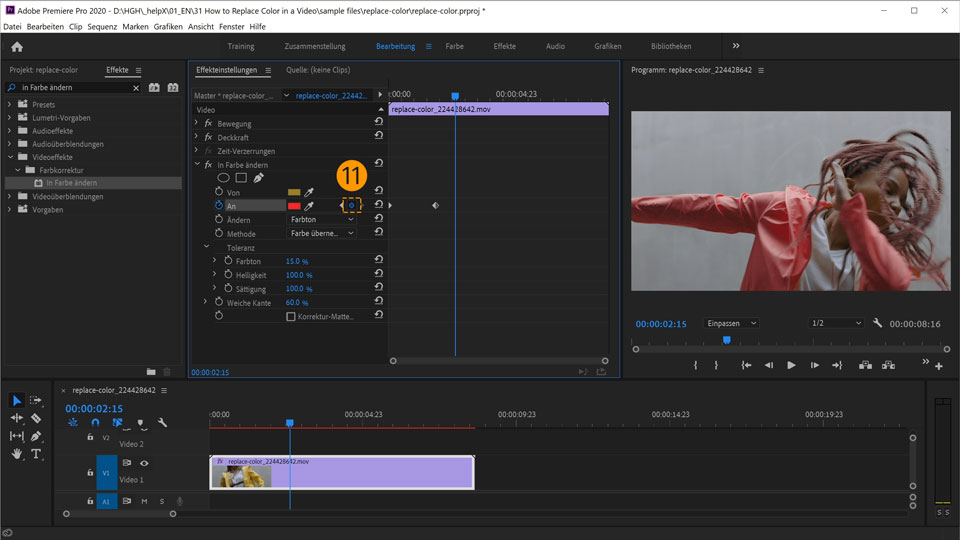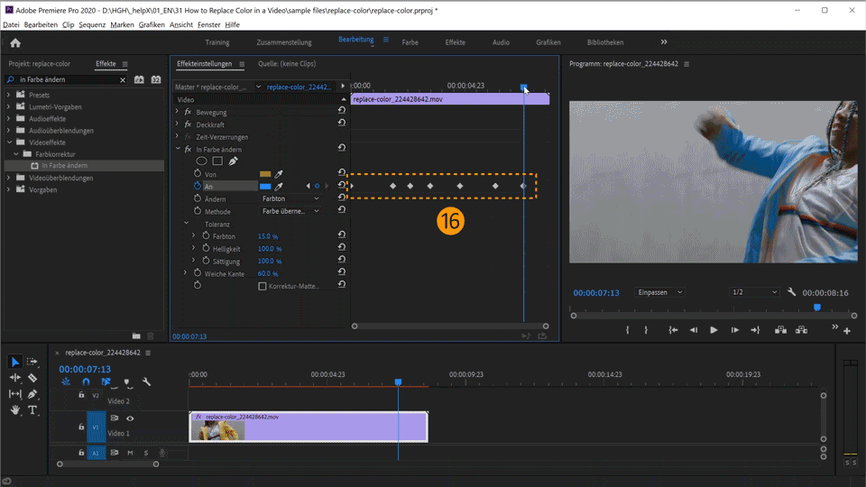 14. Verschiebe den Abspielkopf erneut. Ändere in den Einstellungen zum Effekt In Farbe ändern unter An die Farbe in Blau.