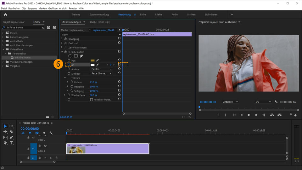 6. Positioniere den Abspielkopf am Anfang des Clips. Klicke in den Einstellungen für In Farbe ändern auf die Stoppuhr neben An. Damit erzeugst du einen Keyframe am Anfang der Animation. Später wirst du im Schnittfenster weitere Keyframes erstellen – an den Stellen, an denen eine Farbe geändert werden soll.