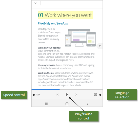 Acrobat unterstützt die Funktion Vorlesen, über die du Dokumente in der Sprache deiner Wahl vorlesen lassen kannst. Wenn sich das Gerät im Lautsprechermodus befindet oder mit einem Smart-Home-Gerät oder mit Kopfhörern verbunden ist, wirst du von der App aufgefordert, die Option „Vorlesen“ auszuwählen.