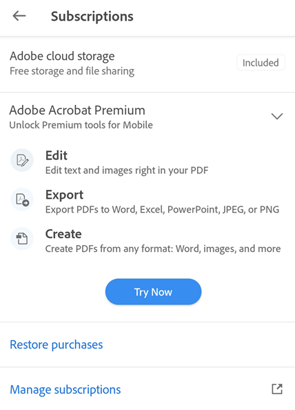 Hvis du har købt et årsabonnement på Acrobat Premium med en gratis prøveversion via appbutikken, opkræves du ikke under den gratis prøveversion. Du skal opsige dit abonnement via appen, inden prøveperioden slutter, for at undgå betaling. Du opkræves automatisk, når den gratis prøveversion slutter.
