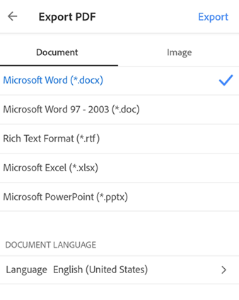 To change the language, tap Language and select a different language. By default, the export language is the same as your installed app. Acrobat iOS supports many export languages.