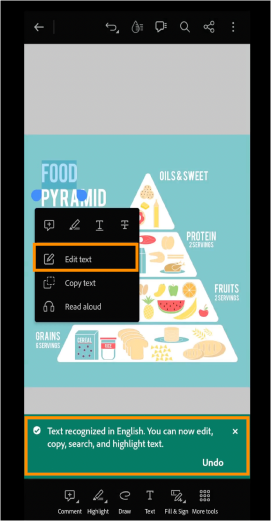 > Recognize text.Once Acrobat recognizes the text, it will display a message stating that you can edit, copy, search, and highlight text in the document.