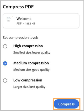 Compress PDF.In the compress dialog that opens, select a compression level and tap Compress.