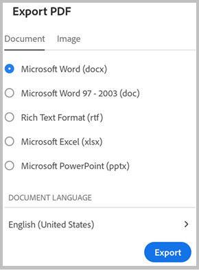 When exporting to document formats, Acrobat uses OCR to convert scanned text to editable text. OCR doesn’t apply when exporting to image formats.